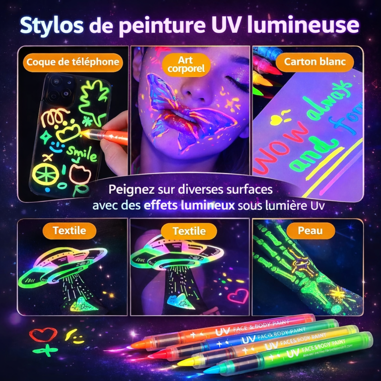 Ajoutez de la couleur en un geste avec ce lot de 8 feutres, pensé pour le maquillage et la décoration d’objet. Les feutres fluorescents – 8 couleurs permettent de créer des traits nets, fun et visibles, parfaits pour transformer un visage, un accessoire ou un objet en quelques minutes. Sous lumière UV, les couleurs révèlent un effet fluo qui attire l’œil et donne tout de suite une ambiance plus festive.