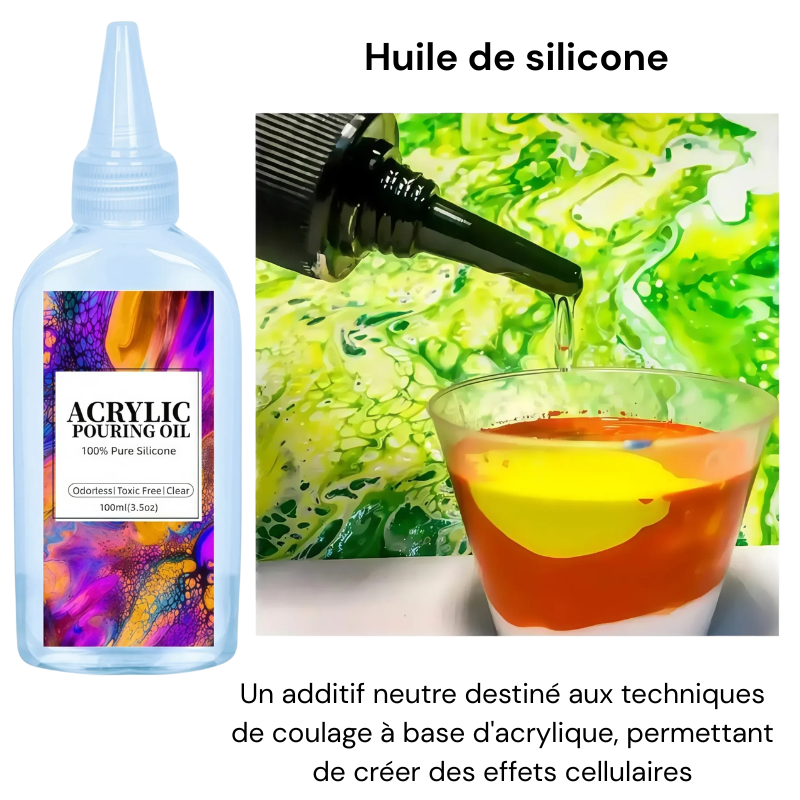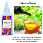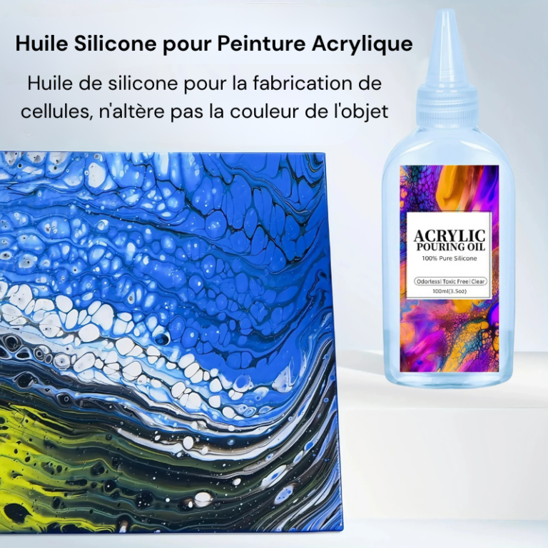 Huile Silicone pour Peinture Acrylique – Effet Cellules pour Art Fluide permet de créer facilement de belles cellules dans vos réalisations de peinture acrylique coulée. Quelques gouttes suffisent pour transformer le rendu et donner à vos créations un effet visuel plus vivant, plus riche et plus original. Vous obtenez un résultat décoratif fort sans geste compliqué, ce qui rend cette huile pratique pour tester de nouveaux effets sur vos supports.