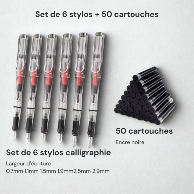 La pointe dorée apporte une touche élégante tout en gardant une bonne résistance dans le temps. Le stylo calligraphie à encre rechargeable – set de 6 stylos plumes combine style, confort d’écriture et usage polyvalent pour vos projets créatifs. Le stylo calligraphie à encre rechargeable – set de 6 stylos plumes est pensé pour celles et ceux qui veulent une belle écriture avec un outil simple à utiliser.